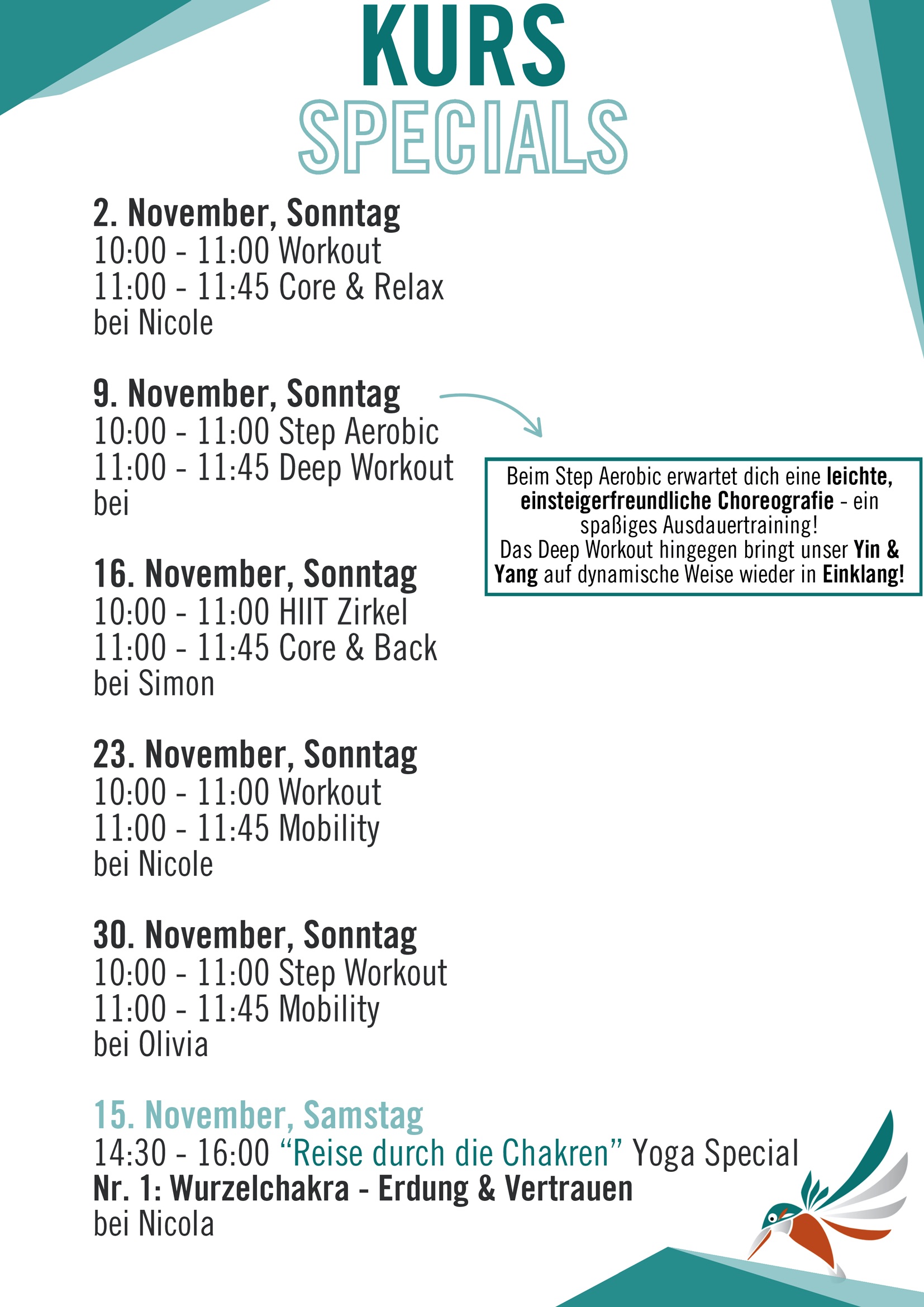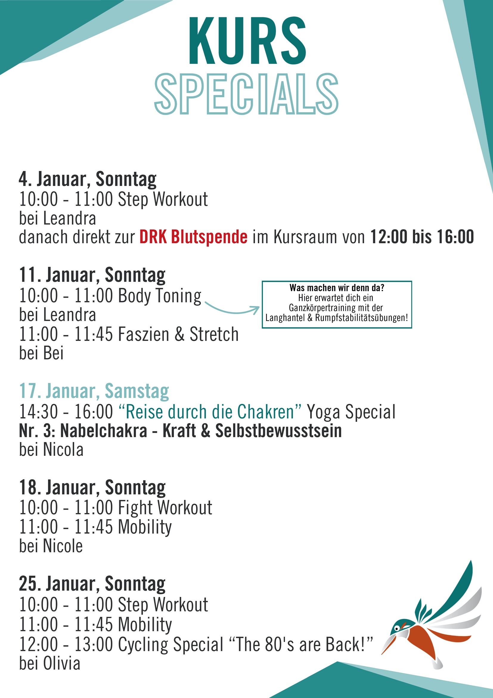 Unsere Kurstrainer/-innen sorgen mit abwechslungsreichen Übungen & motivierender Musik dafür, dass das Gruppentraining effektiv, herausfordernd & unterhaltsam wird.